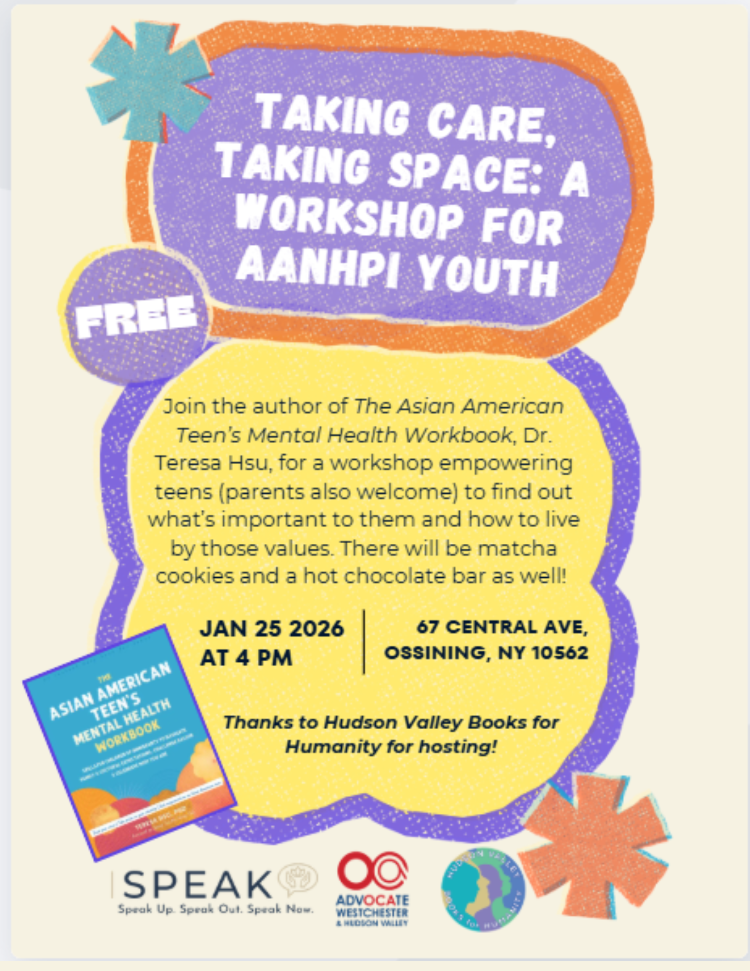 Join the author of the Asian American Teen’s Mental Health Workbook, Dr. Teresa Hsu, for a workshop empowering teens (parents also welcome) to find out what’s important to them and how to live by those values. There will be matcha cookies and a hot chocolate bar as well!